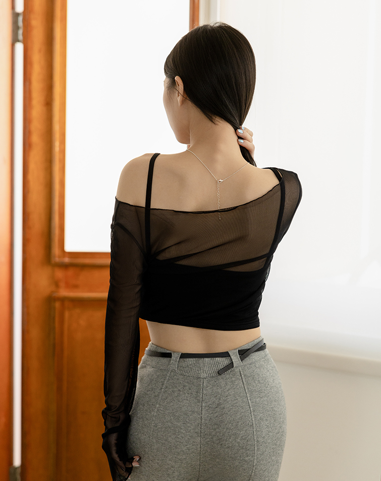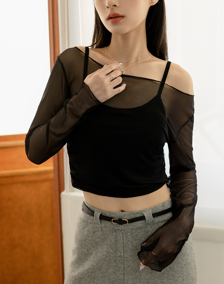 柔光透紗木耳捲邊長袖上衣(附胸墊)