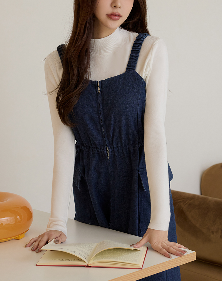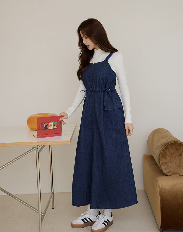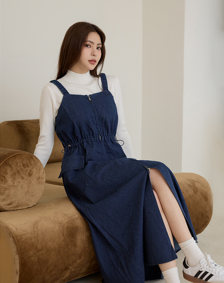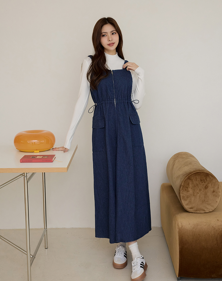 胸前拉鍊/腰兩側抽繩/A字傘擺/兩側口袋